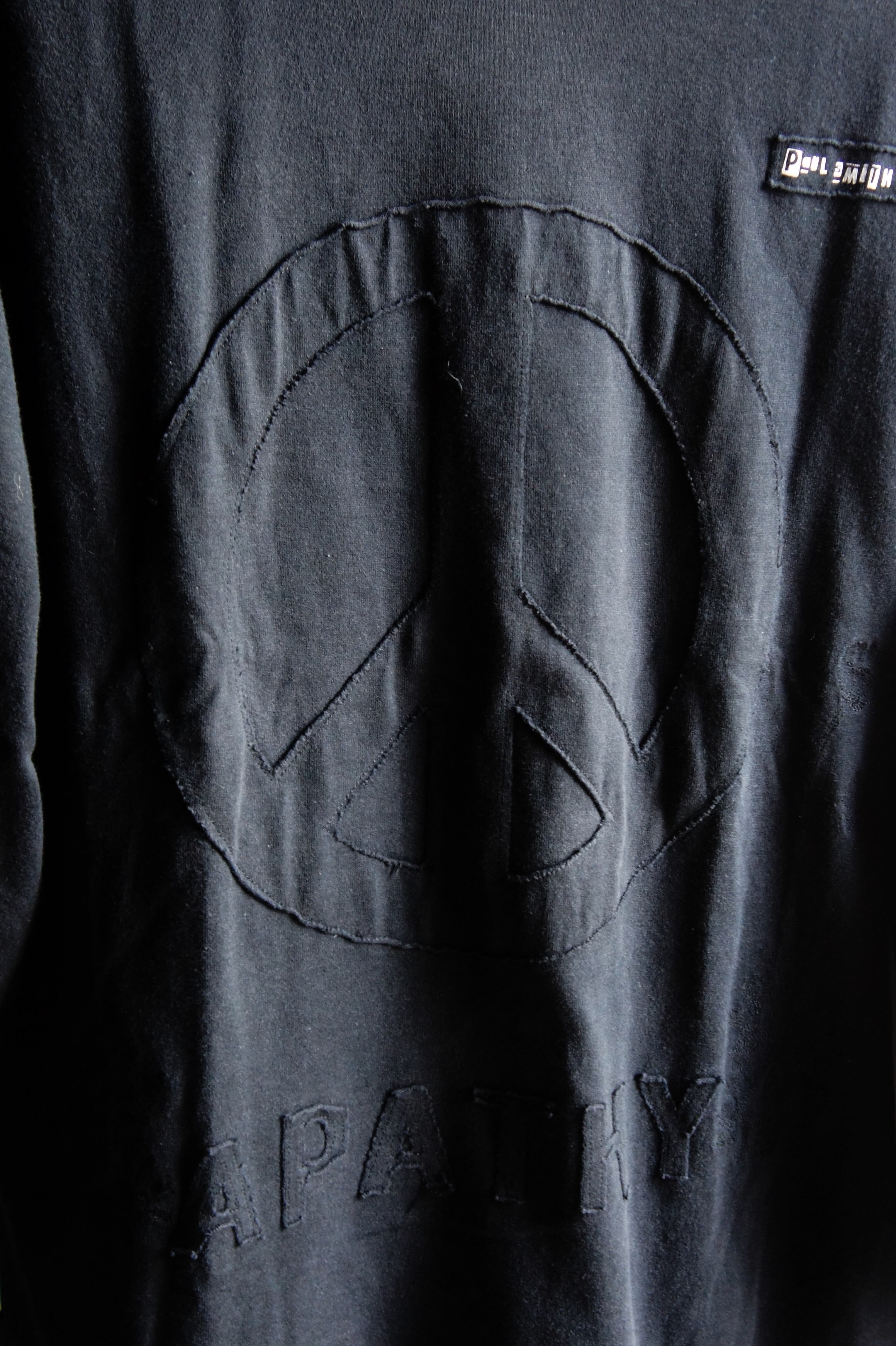 フロントに同生地によるデザインとして''平和''を象徴とするピースマークと、その下部に''無関心''を意味するAPATHY''という相反するようなデザインを落とし込んでいます。
