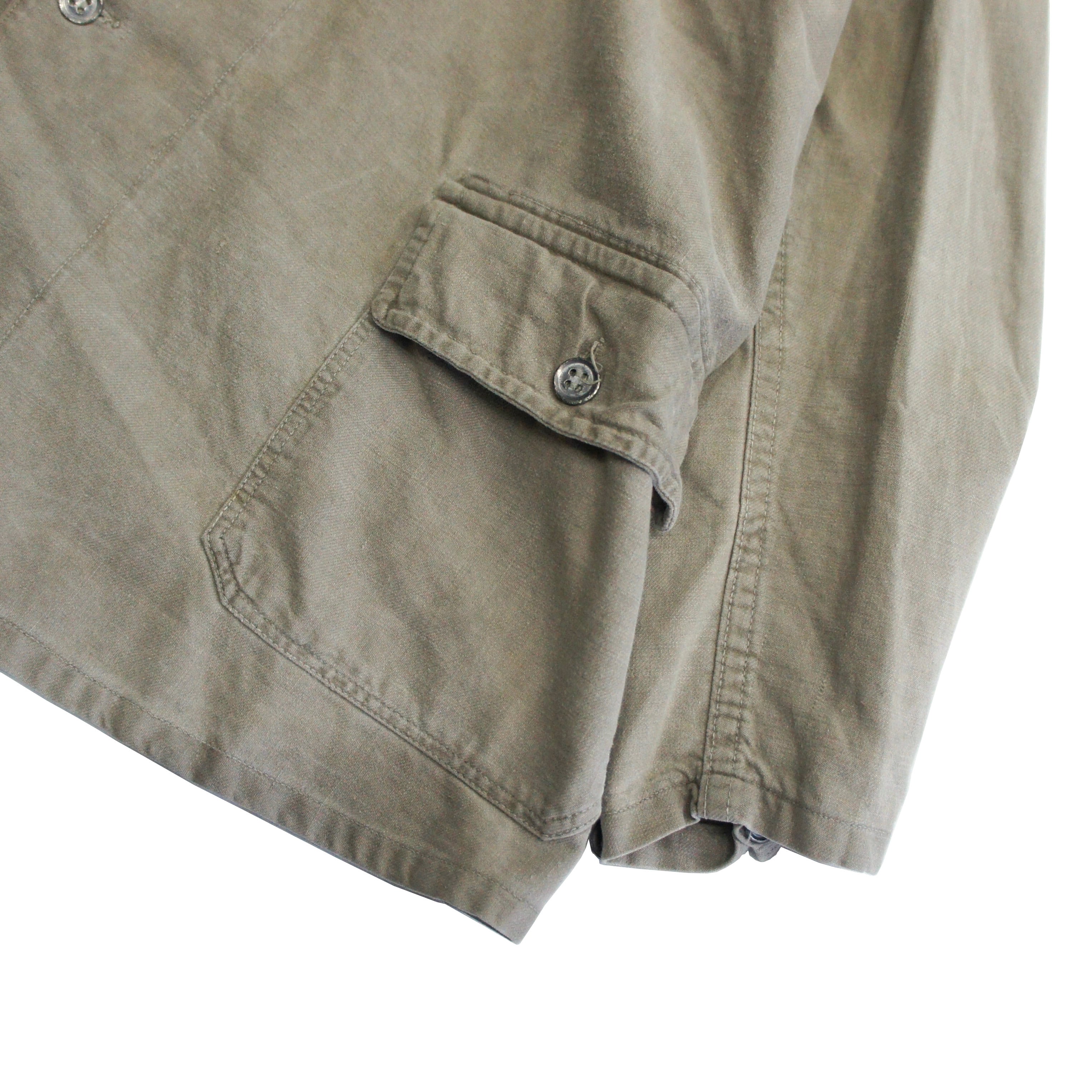 こちらはアルミボタンがメインに使用されています。シャツジャケットのように着用できる生地感のヴィンテージ感漂うコットンツイル素材が使用されており、ワークジャケットらしい風合いをお楽しみいただけます。フロントはボタンで開閉でき、胸元にはボタン開閉のフラップポケットが備わっています。袖口はシンプルながらも調節可能なデザインです。