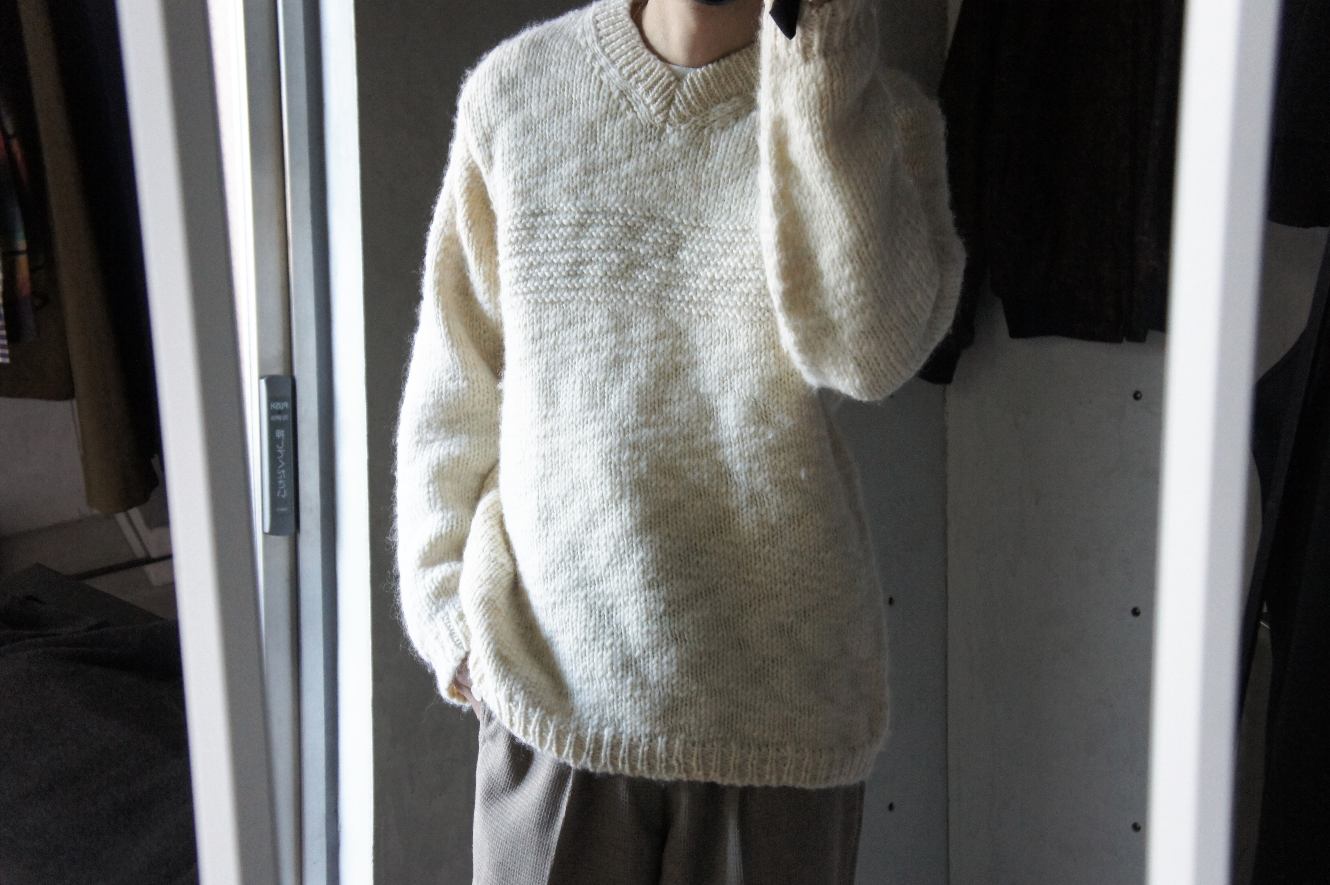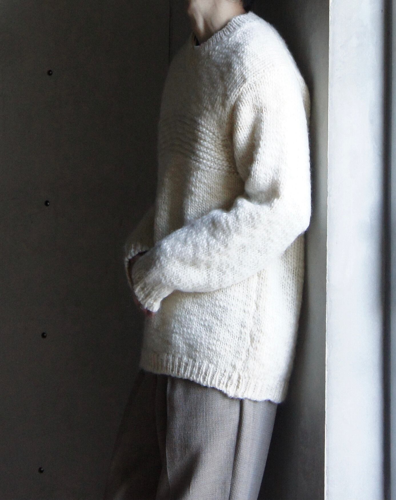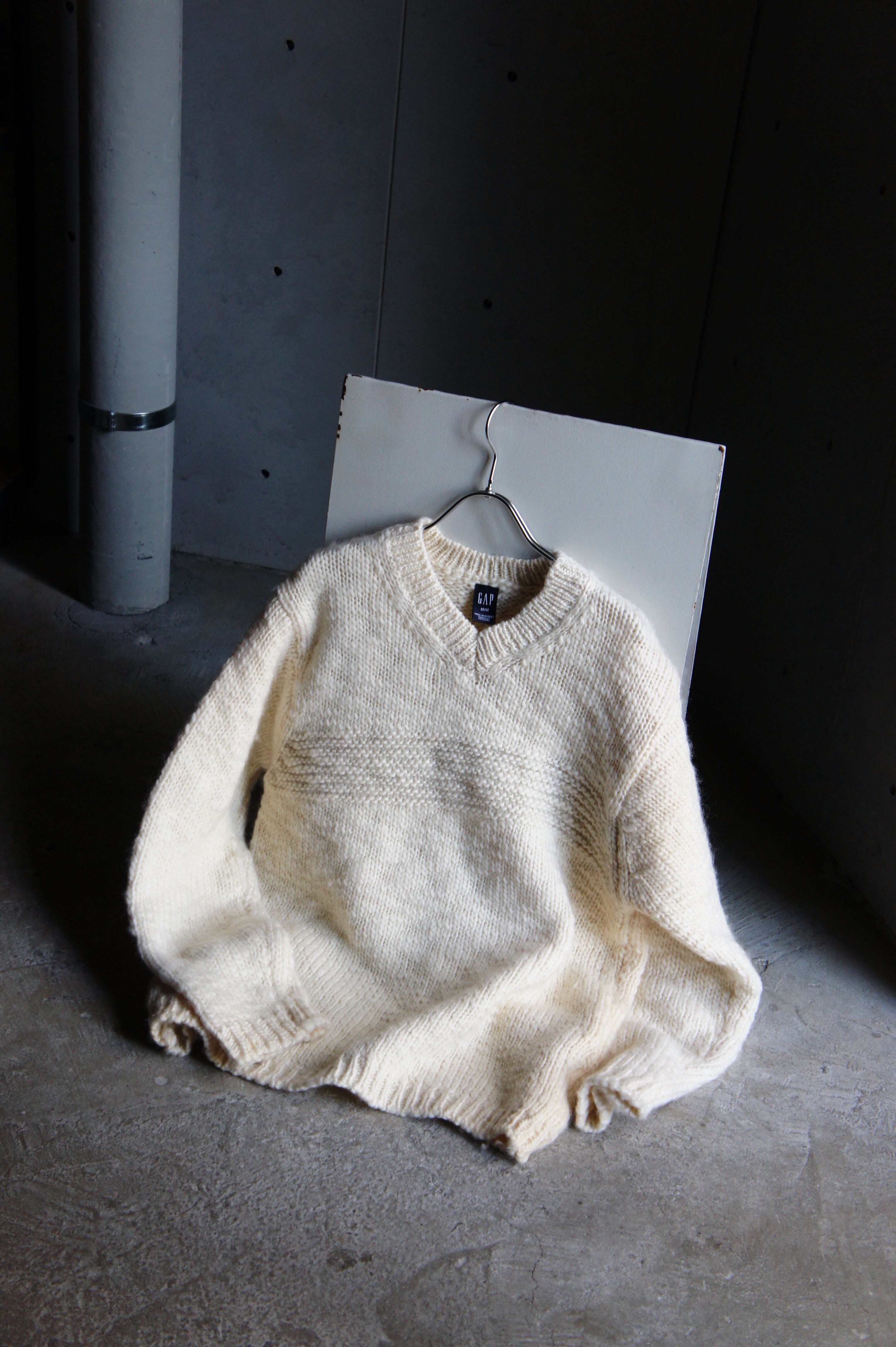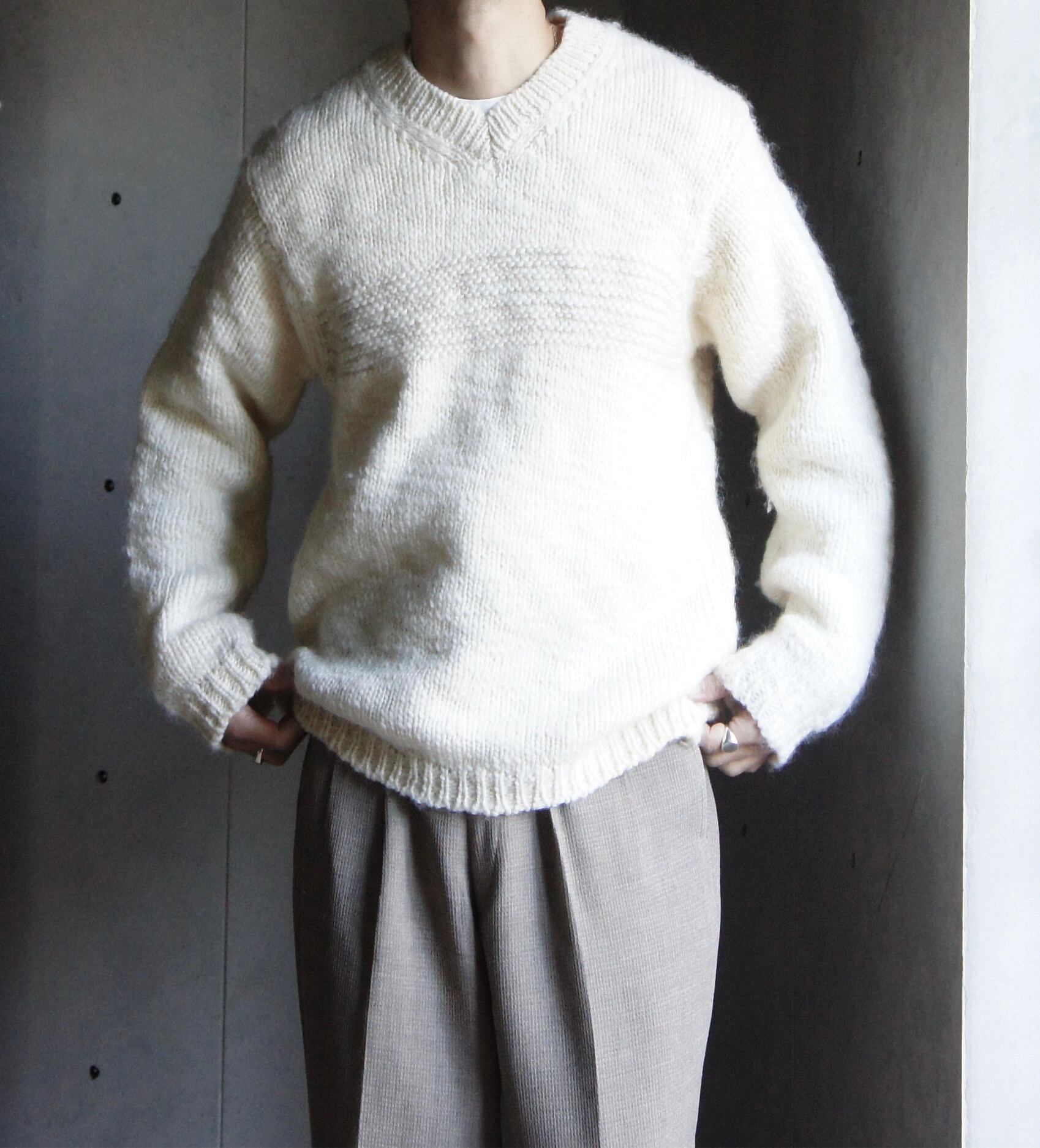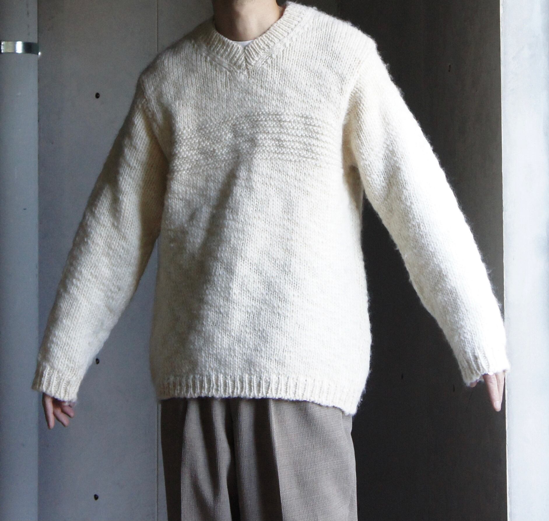 編みのざっくりとしたローゲージとオフホワイトのカラーバランスが絶妙にマッチしていて最高ですね!!
