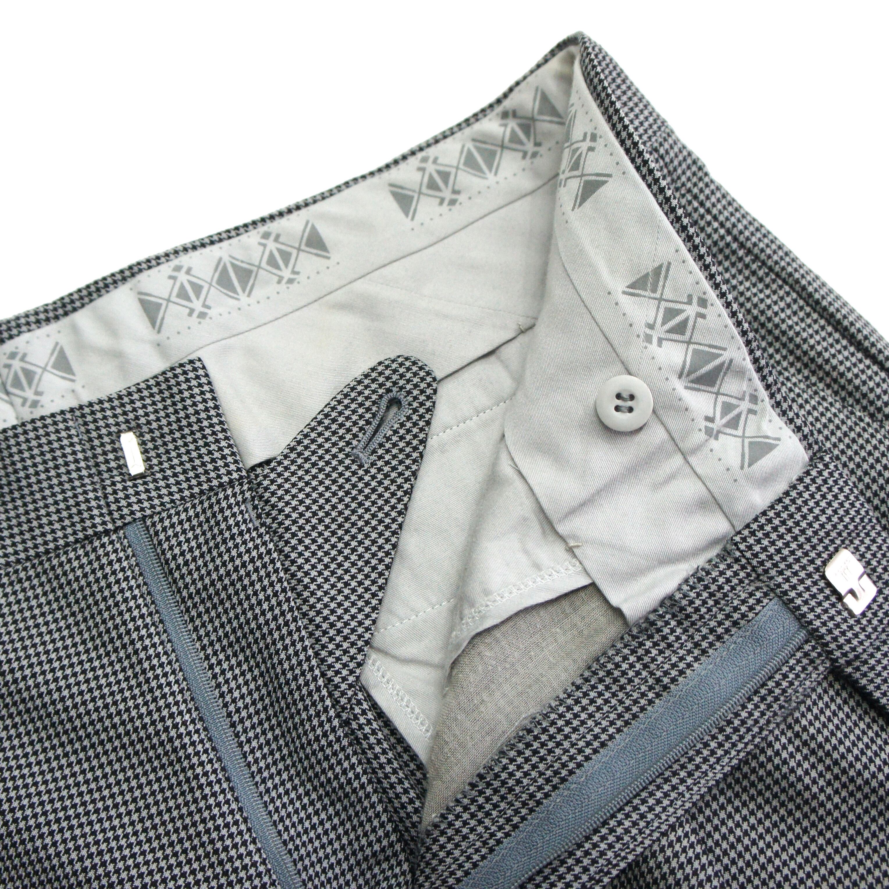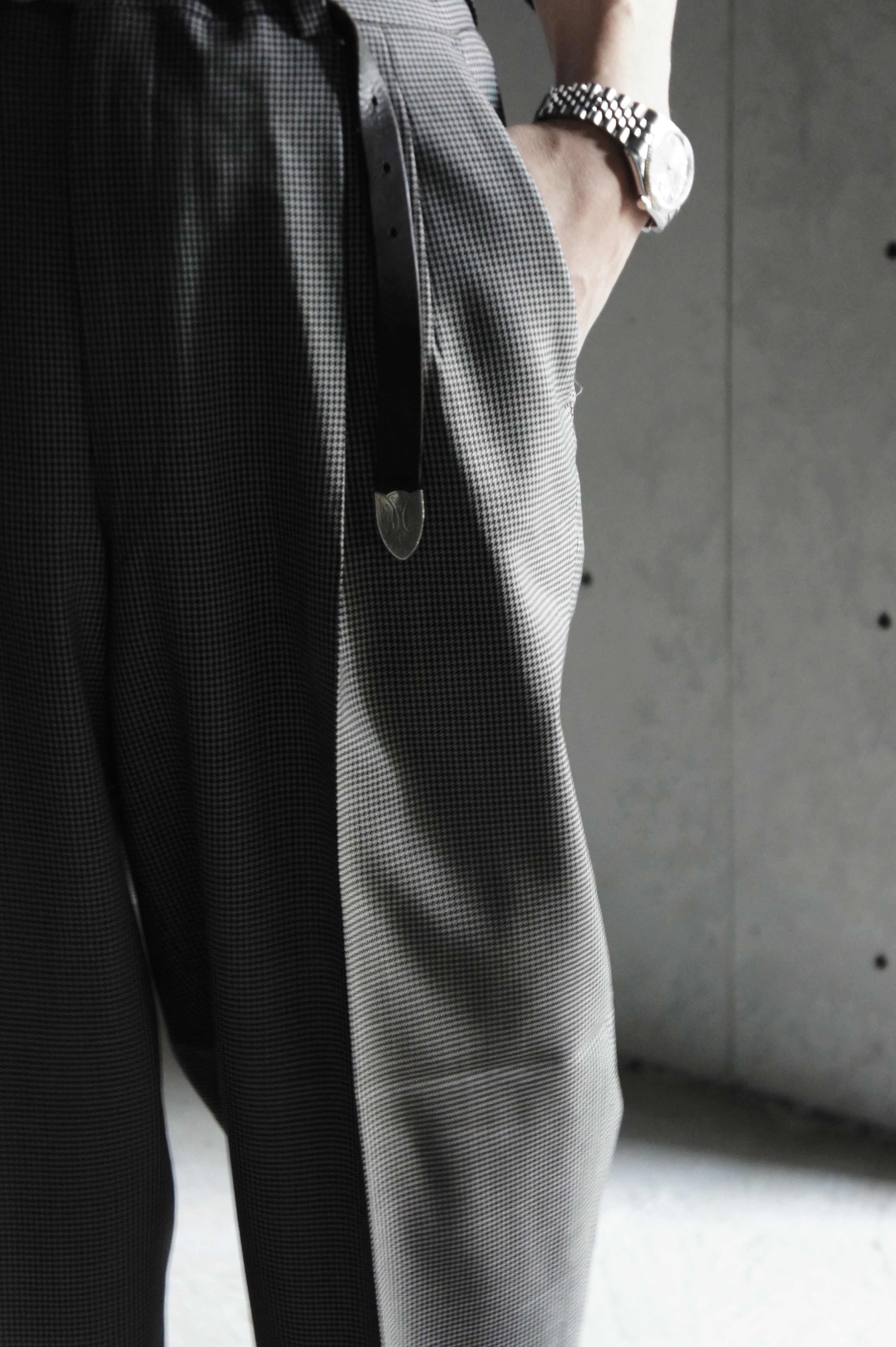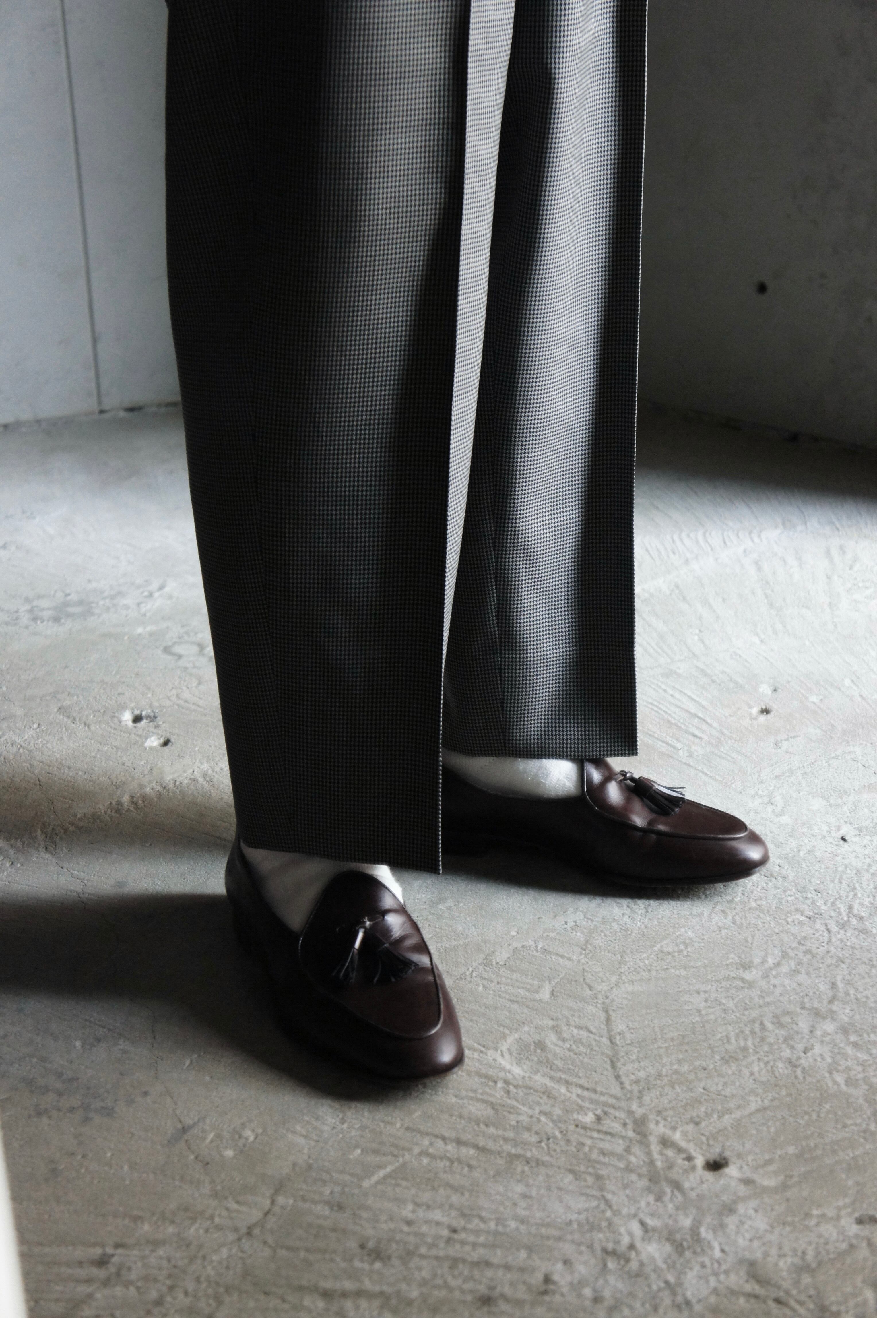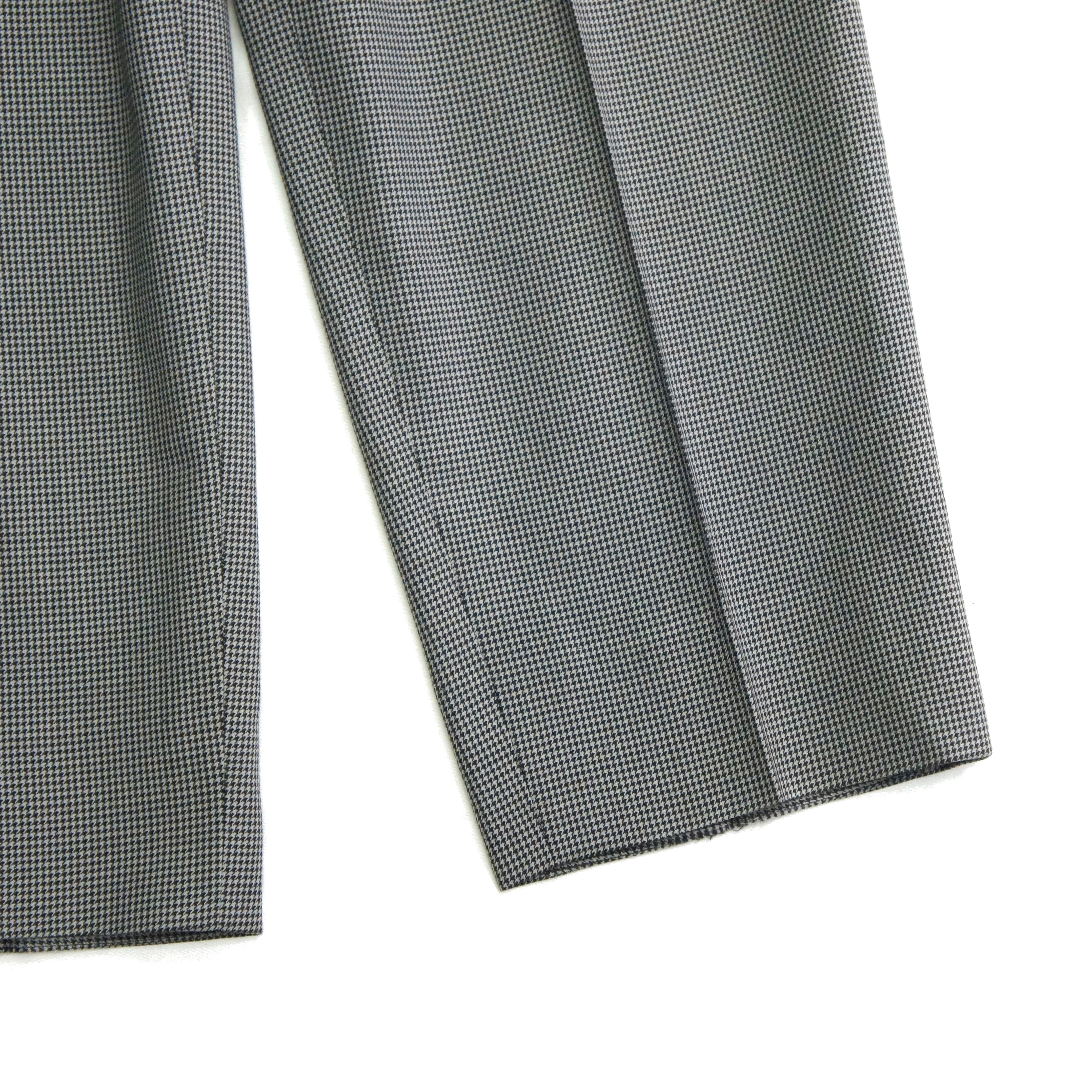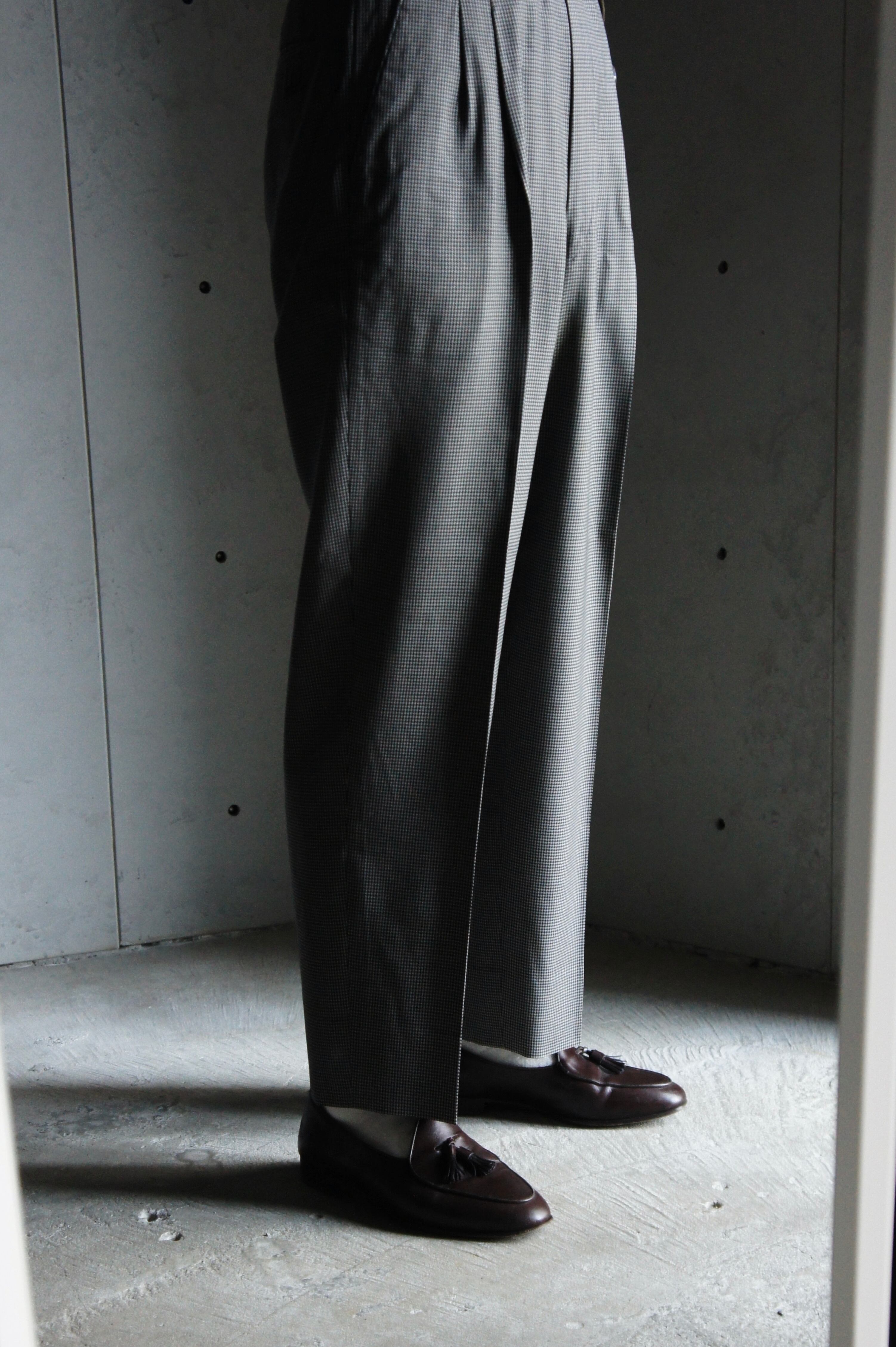 上品なストレートシルエットのスラックスは、近くで見ないと分からない程度の細かい千鳥格子柄。