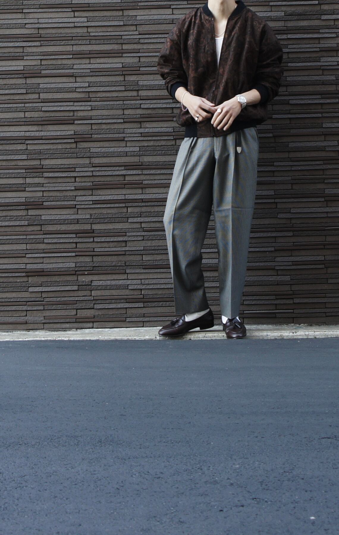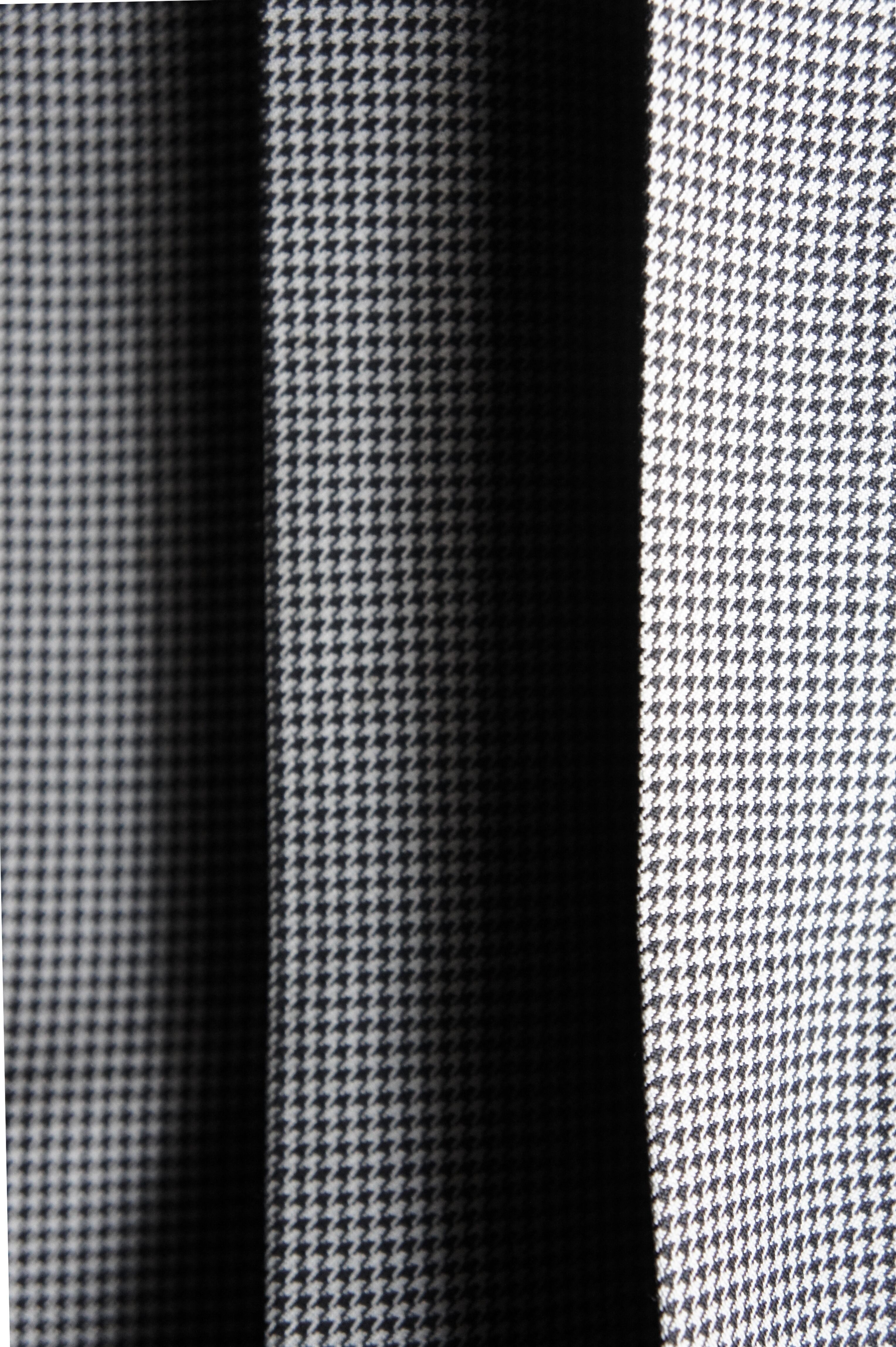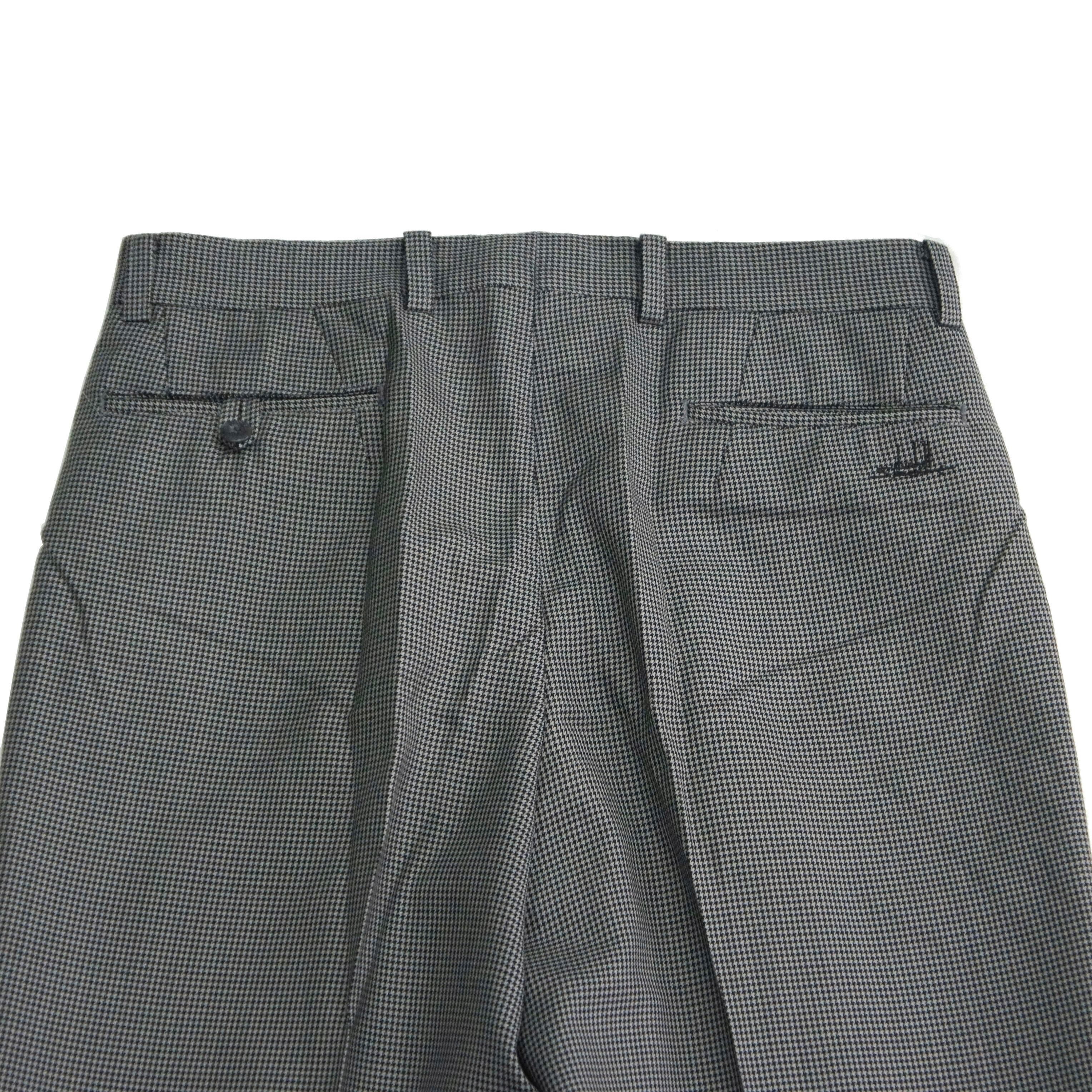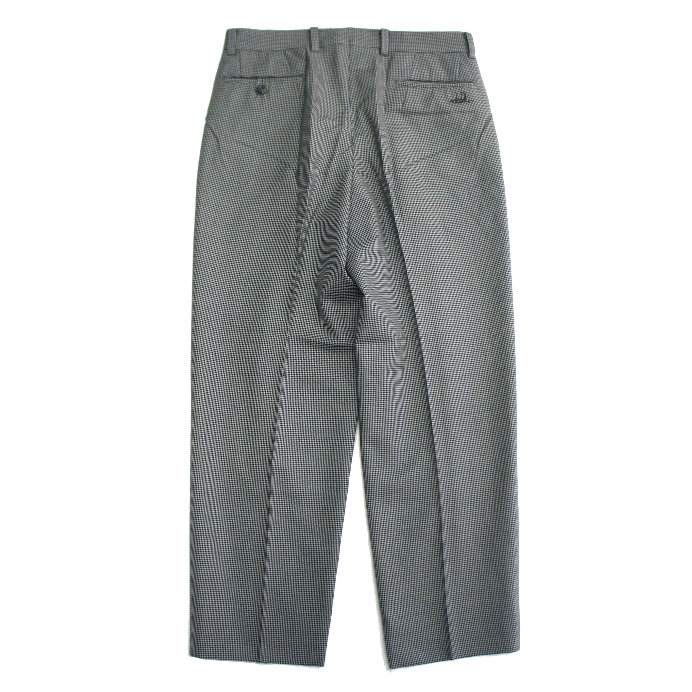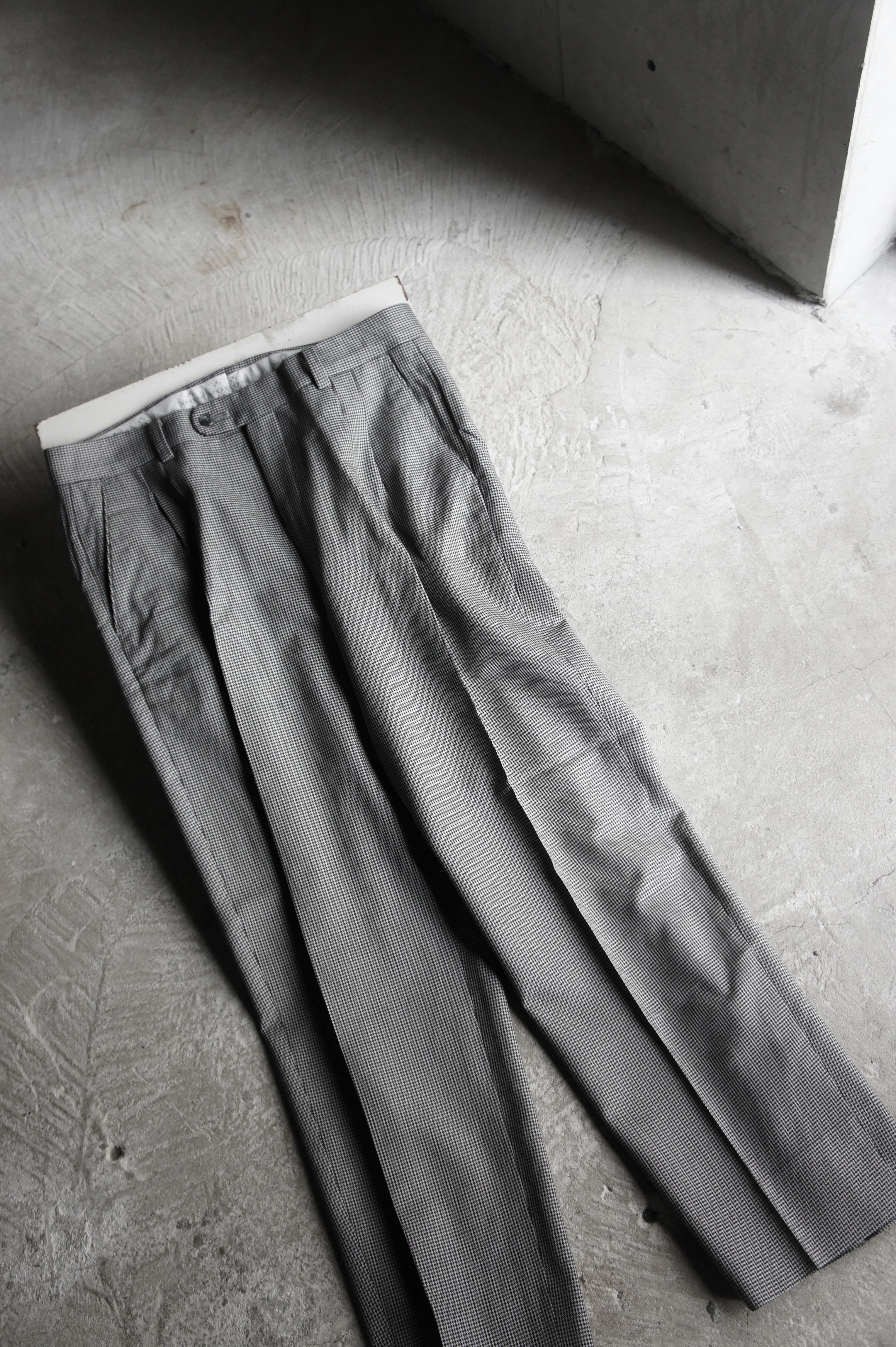 上品なストレートシルエットのスラックスは、近くで見ないと分からない程度の細かい千鳥格子柄。