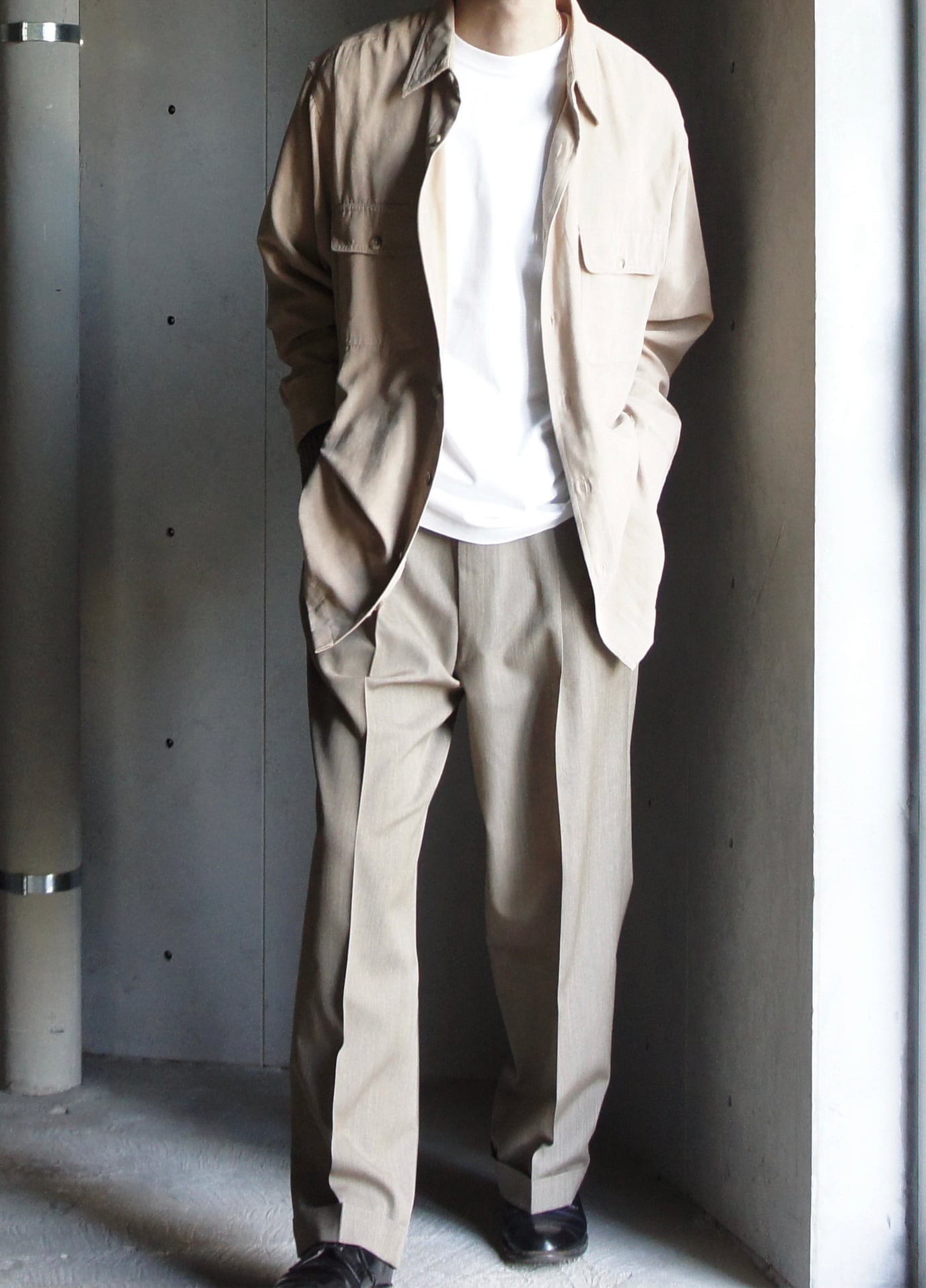 2タックのベーシックなディテールですが、縦にラインが入るような美しい色味のベージュカラーが最高の1本。