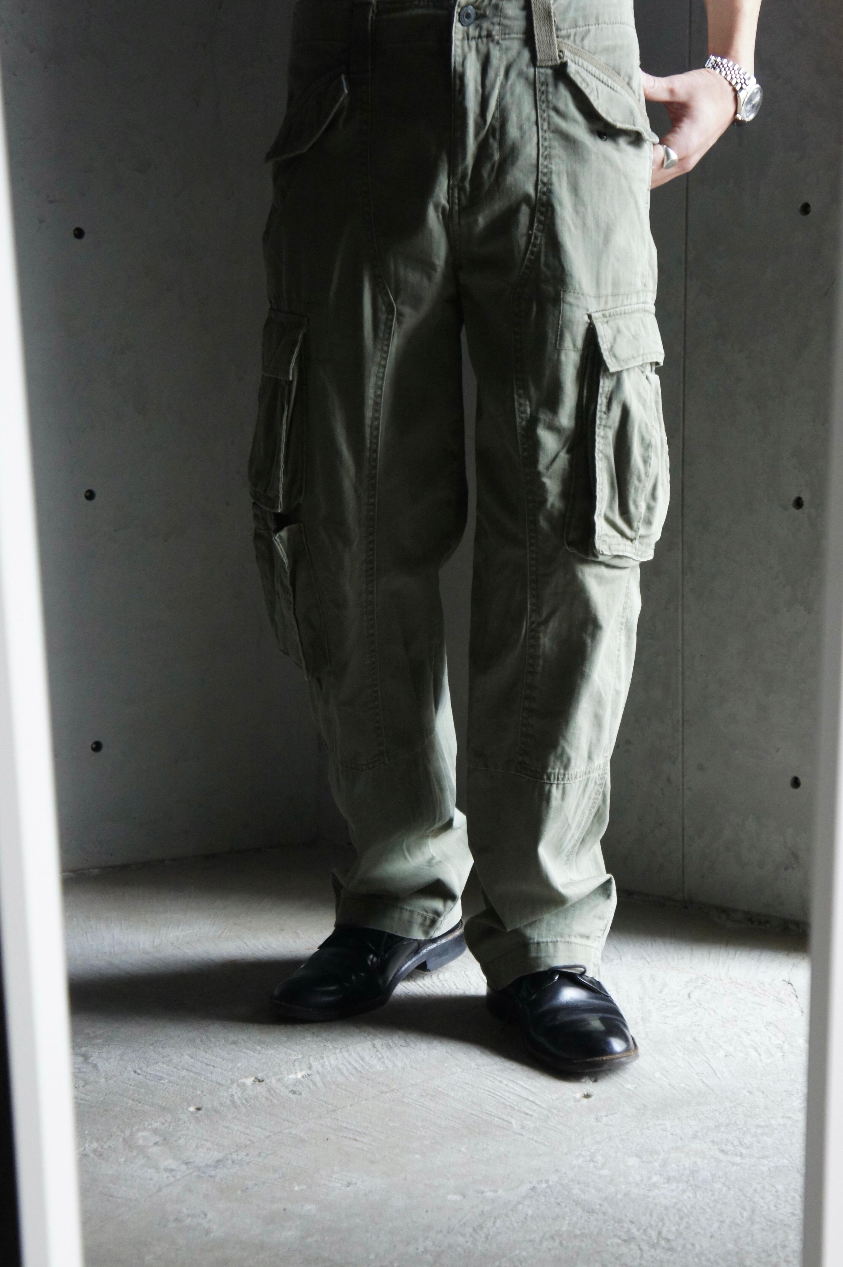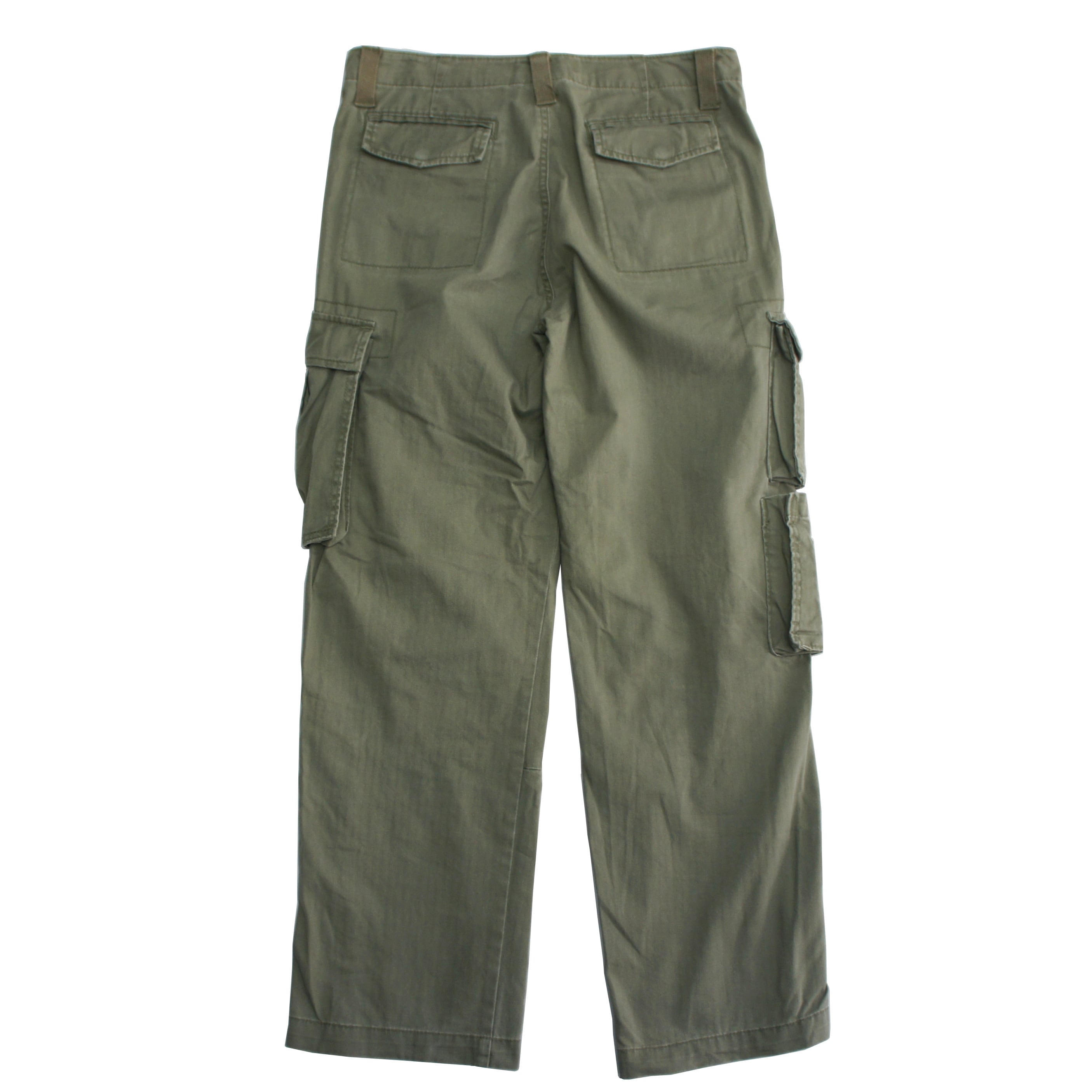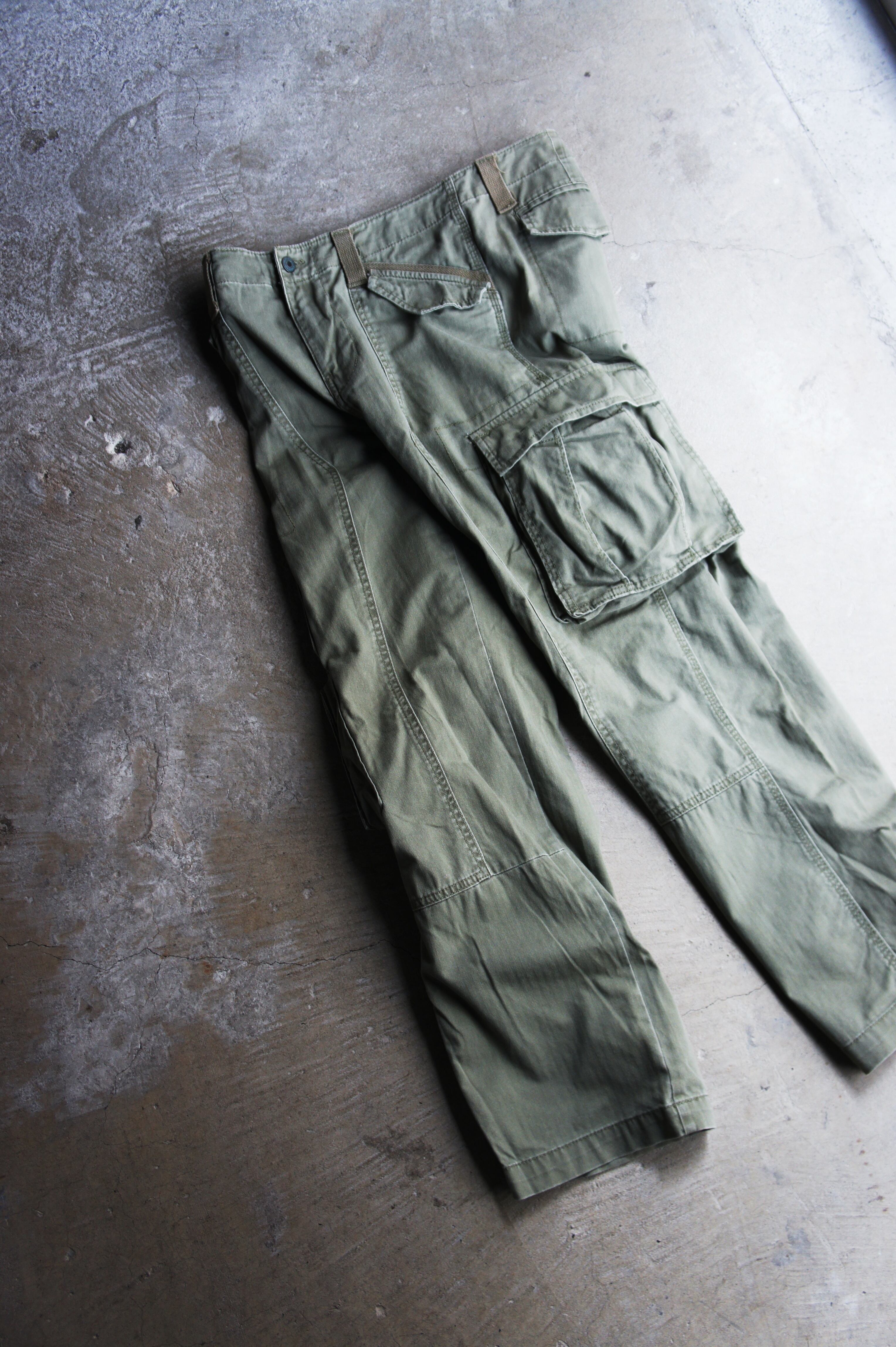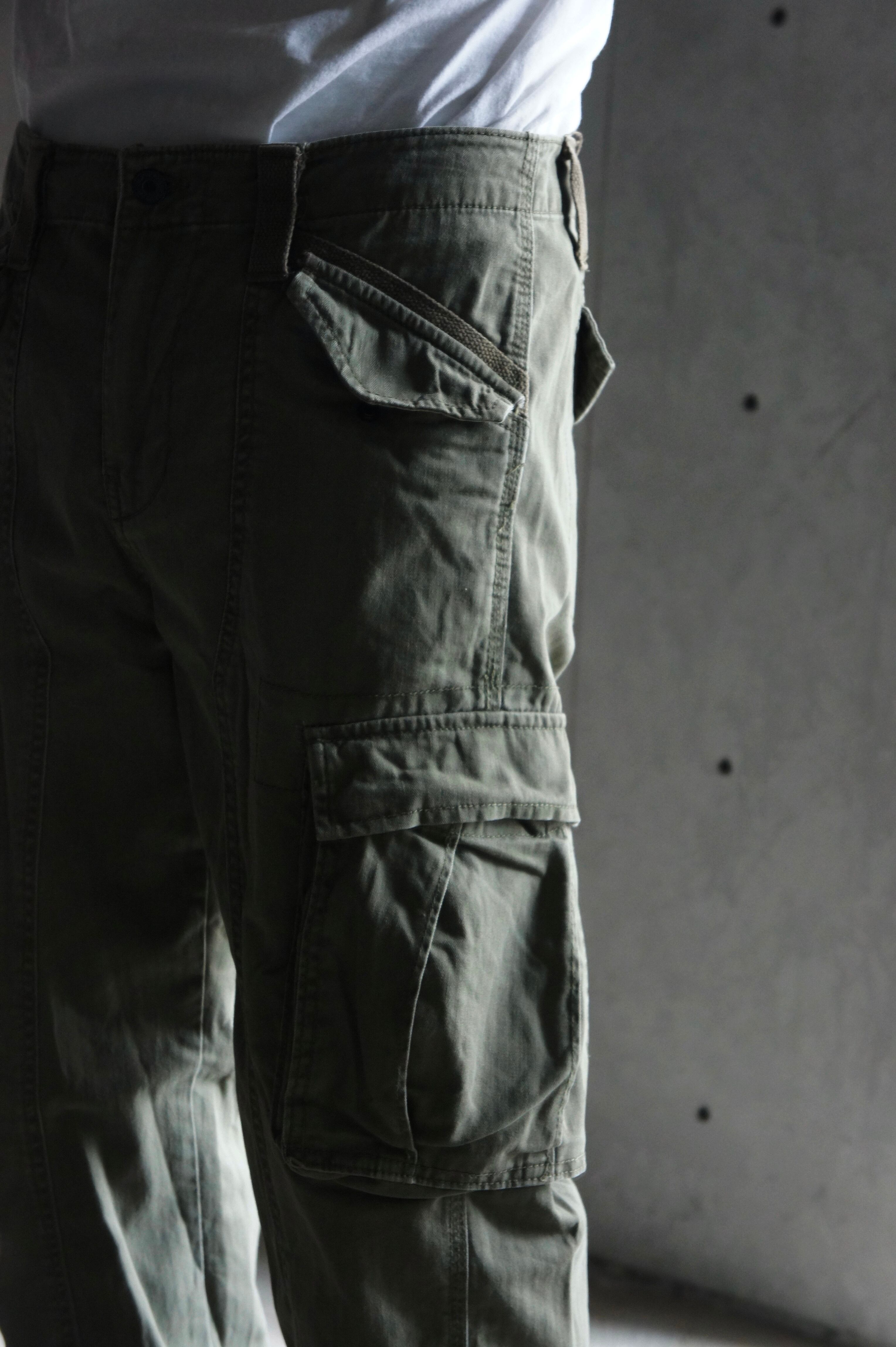 アシンメトリーなポケットの位置が特徴的なカーゴパンツです。