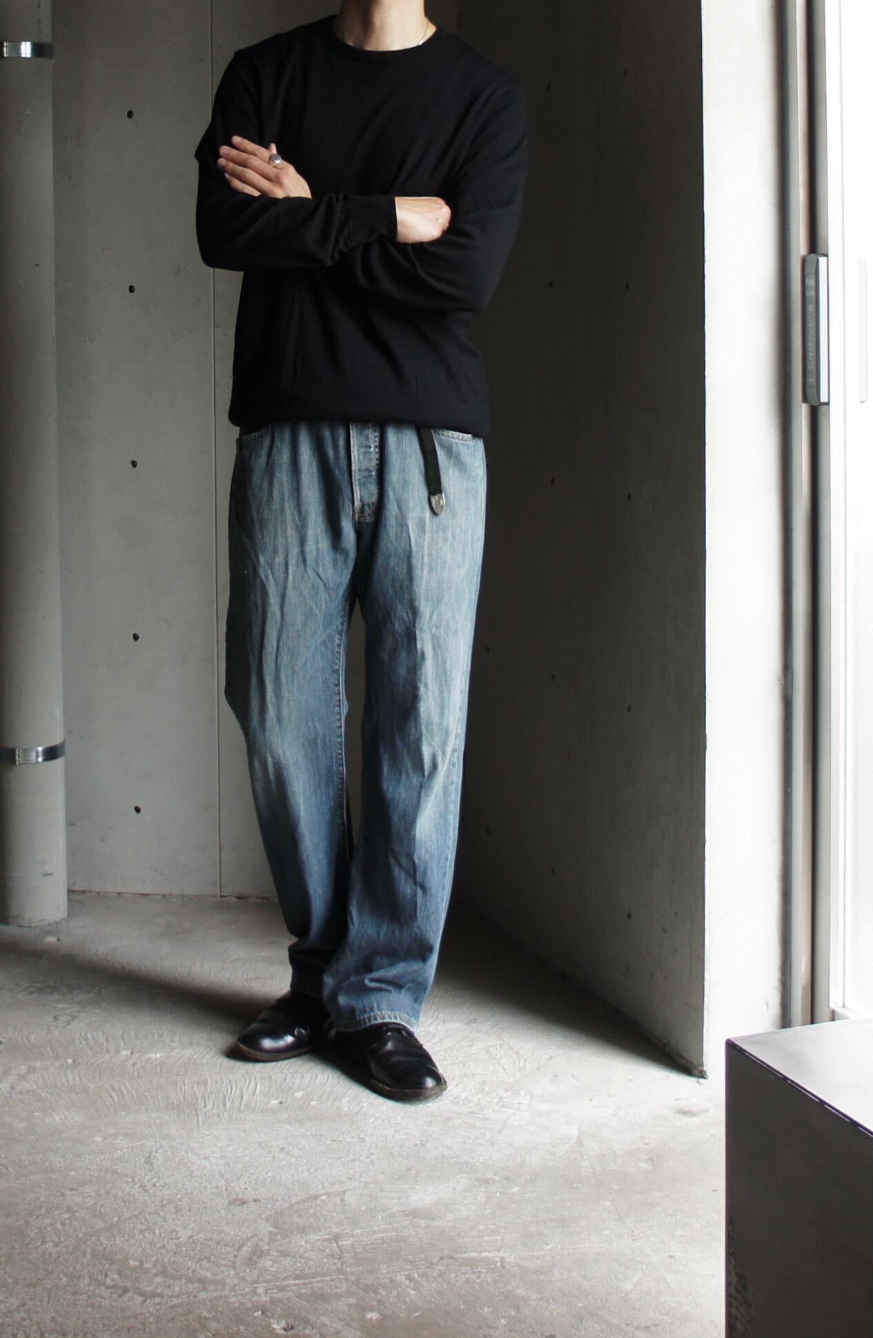 ライトオンスで、淡めの縦落ち感は90sな雰囲気で、ゆるさを出しつつコーディネートに組み込めます。